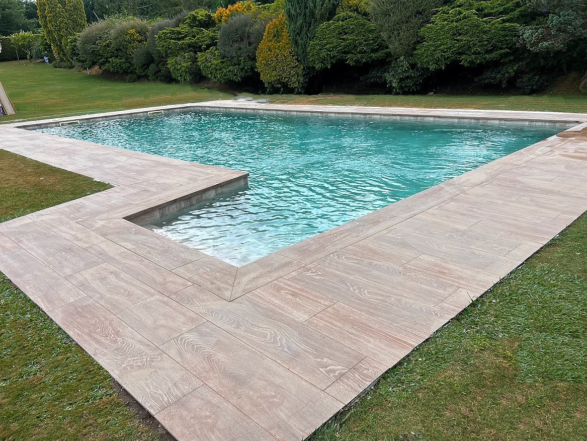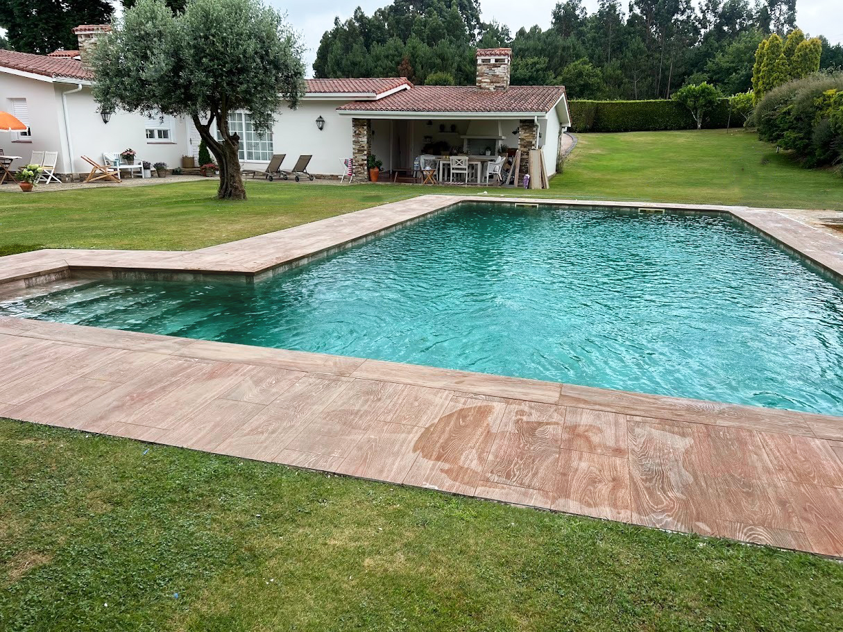 Este piscina coronada con nuestro modelo Kenia es la perfecta fusión entre diseño y funcionalidad. Se ha desarrollado con un porcelánico de la colección madera, que aporta el encanto natural y la calidez de la madera sin renunciar a la durabilidad y resistencia propias de los materiales modernos. La superficie en tonos madera no solo ofrece una estética sofisticada sino que, combinada con una beta delicada y bien definida, transforma el ambiente, creando un espacio visualmente atractivo y armonioso.
